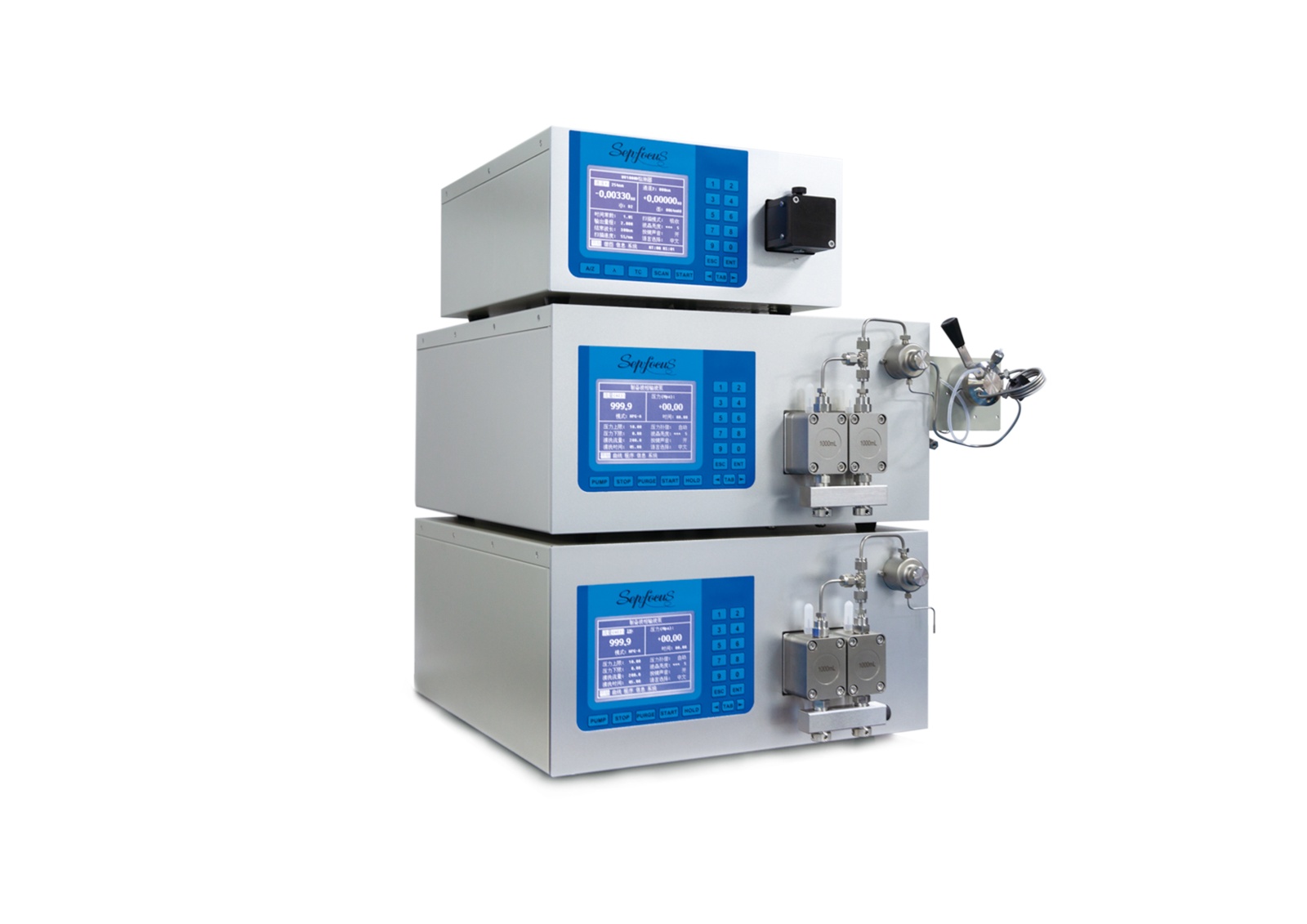 Sepfocus®模块化制备色谱系统可以实现中试到小规模生产需求。稳定的双柱塞往复泵,微处理器控制,高速双驱动和平行泵头具有高速的腔室压力反馈,补偿再填充与溶剂压缩效果,实现在宽动态范围内获得精确,高重现的流速。另外采用轮曲线补偿技术有效控制流量脉冲,保证较低基线噪音,多点流量校正曲线,保证在全流量范围内流量精度。应用专用的混合器,对制备试剂流动路径进行优化,提供高水平的洗脱液混合效率和较低死体积。紫外可见双波长检测器,高灵敏度和宽线性范围,性能优异,可实现双波长检测,波长时间程序和停泵扫描。